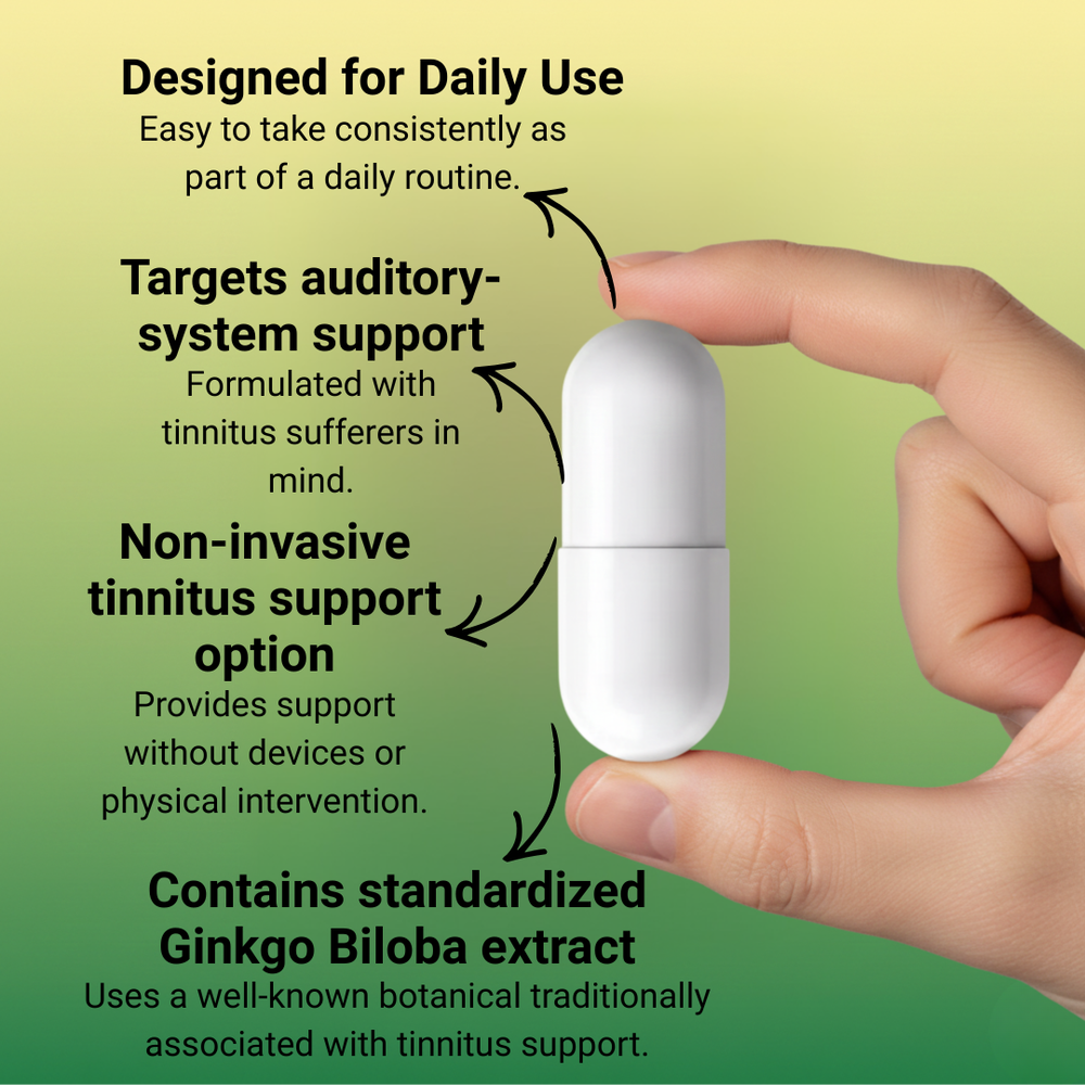 A pharmaceutical-grade Ginkgo Biloba supplement formulated at clinical dosages to address vascular inflammation and restricted blood flow in the auditory pathways—the root cause of circulation-related tinnitus.