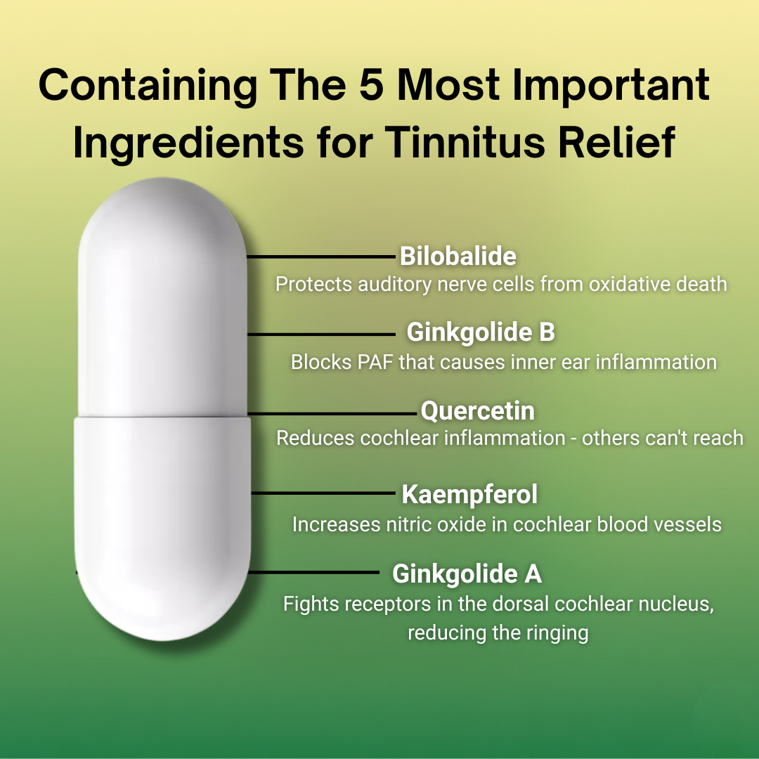 Most tinnitus supplements use 60-80mg of weak, unstandardized extracts. We use 125mg of pharmaceutical-grade Ginkgo - the exact therapeutic dose used in clinical trials. Third-party tested for purity. This is the formulation European doctors have trusted for decades, not generic store-brand Ginkgo.