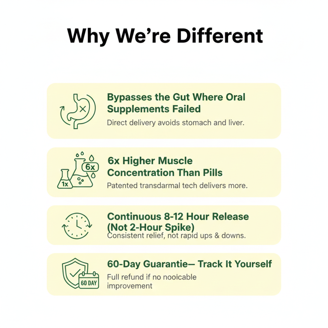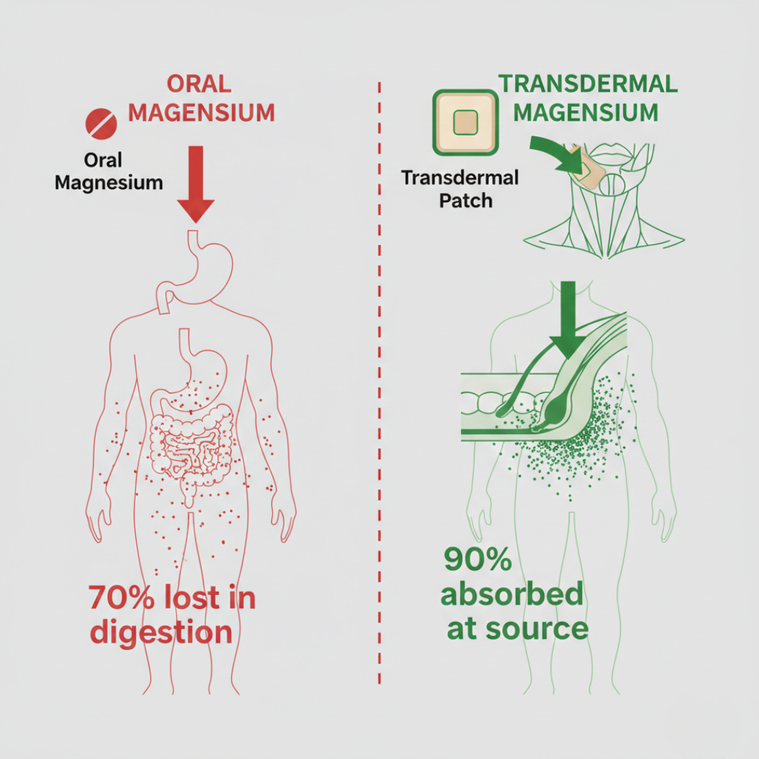 Transdermal patches skip your digestive system completely, delivering concentrated magnesium directly through your skin to the exact muscles causing compression. Clinical studies show 6x higher tissue concentration than oral delivery. That's not a small difference. That's why pills failed and patches work.