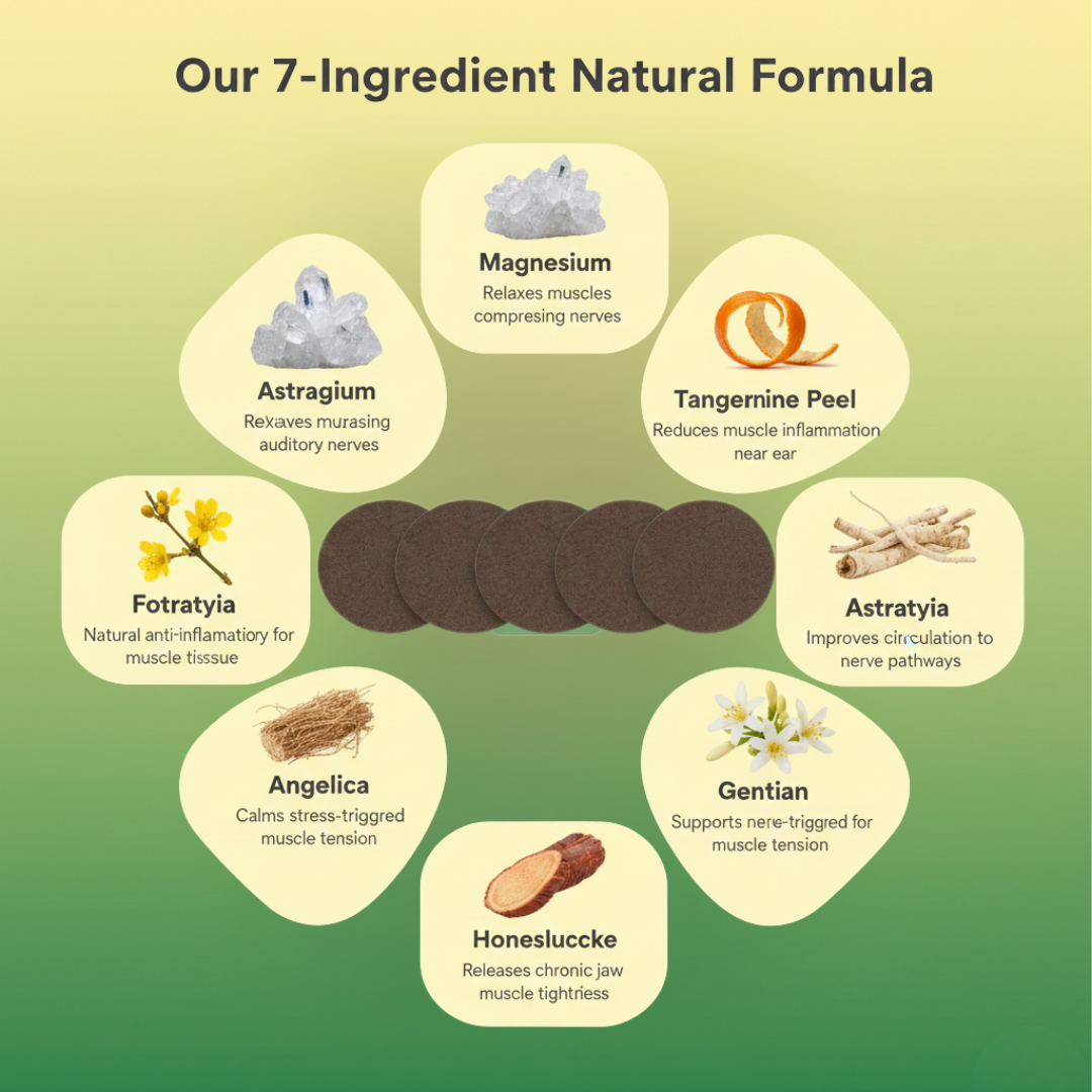 Somatic tinnitus (jaw/neck tension): The patches directly relax the suboccipital muscles that compress auditory nerves. Quick self-test: Can you change your tinnitus volume by moving your jaw, clenching your teeth, or turning your head? If yes, you'll likely see the fastest results - many users notice improvement within 2-3 days.